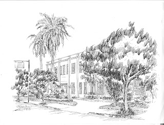 Interpretando uma paisagem urbana em bico de pena com luz direta intensa.